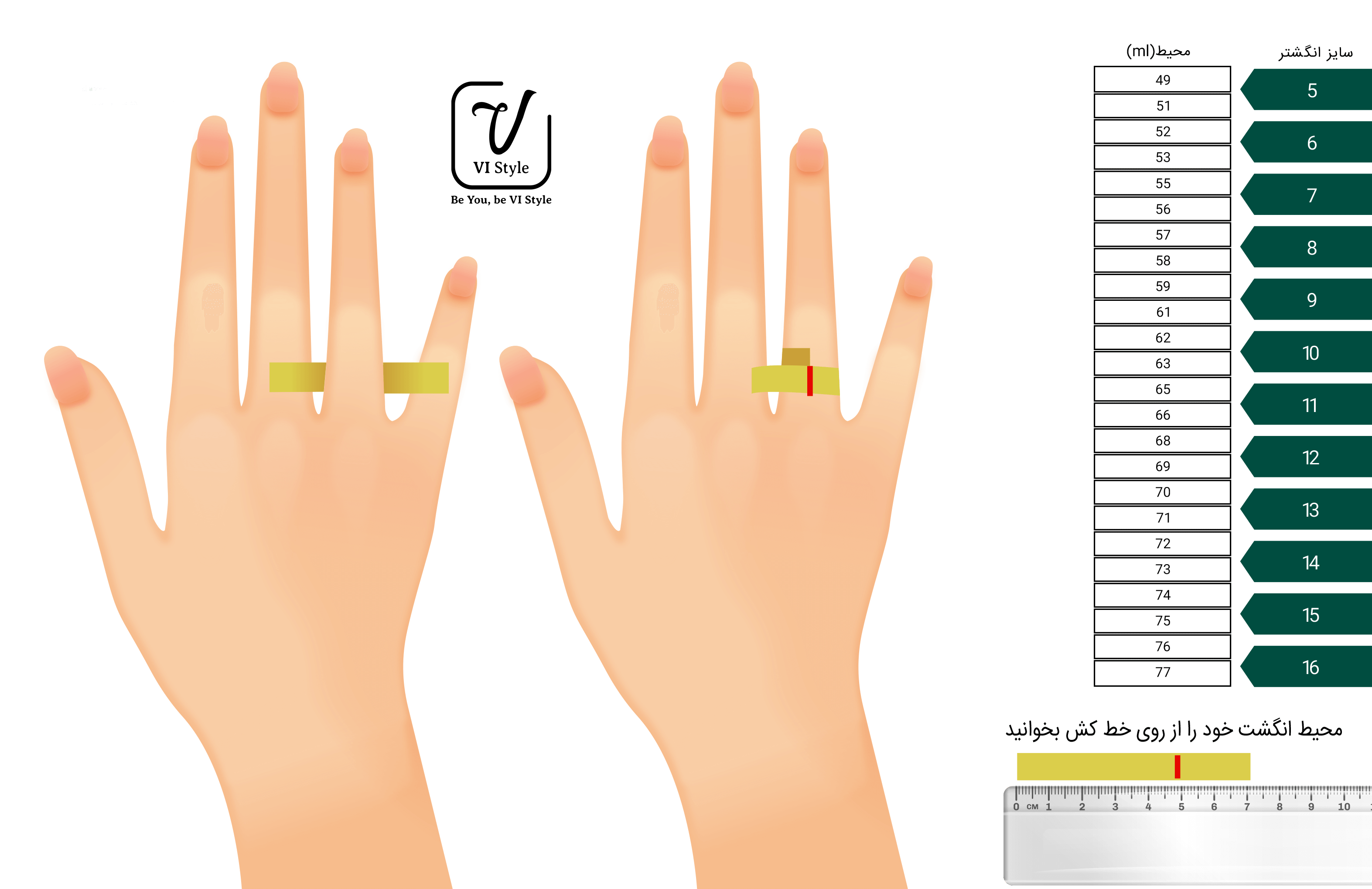 حتماً خطکش را طوری قرار دهید که دقیقاً از مرکز انگشتر عبور کند.